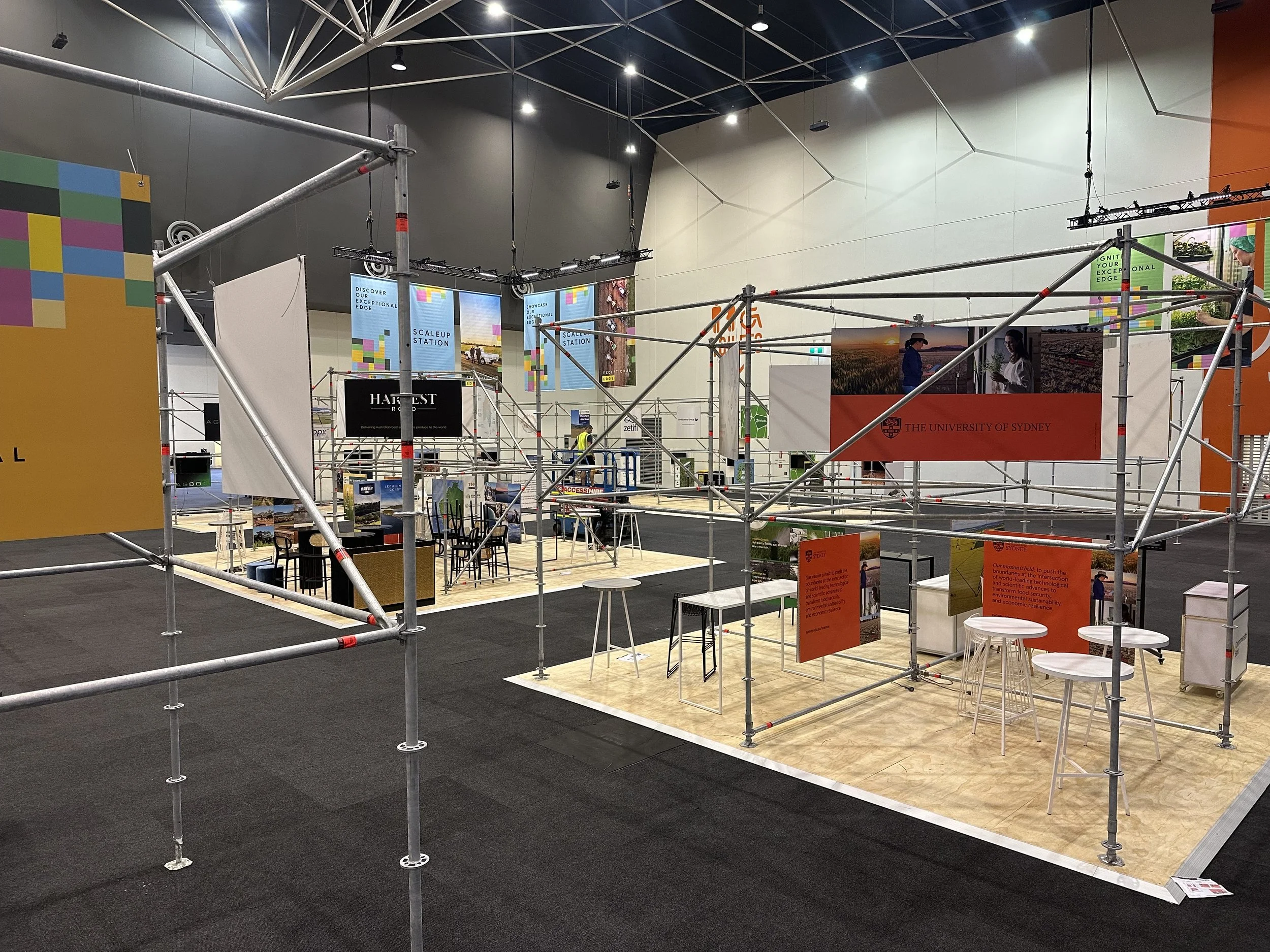 With a brief to deliver scaffold structures as exhibition booths dressed with recyclable signage panels and assorted activation assets, I conceptualised a range of different scaffolds to suit various vendors. My extensive knowledge of the Layher Allround system allowed me to design to the client’s brief, with strict specifications for booth floorspace requiring creative use of some unique and uncommon components in the Layher catalogue.